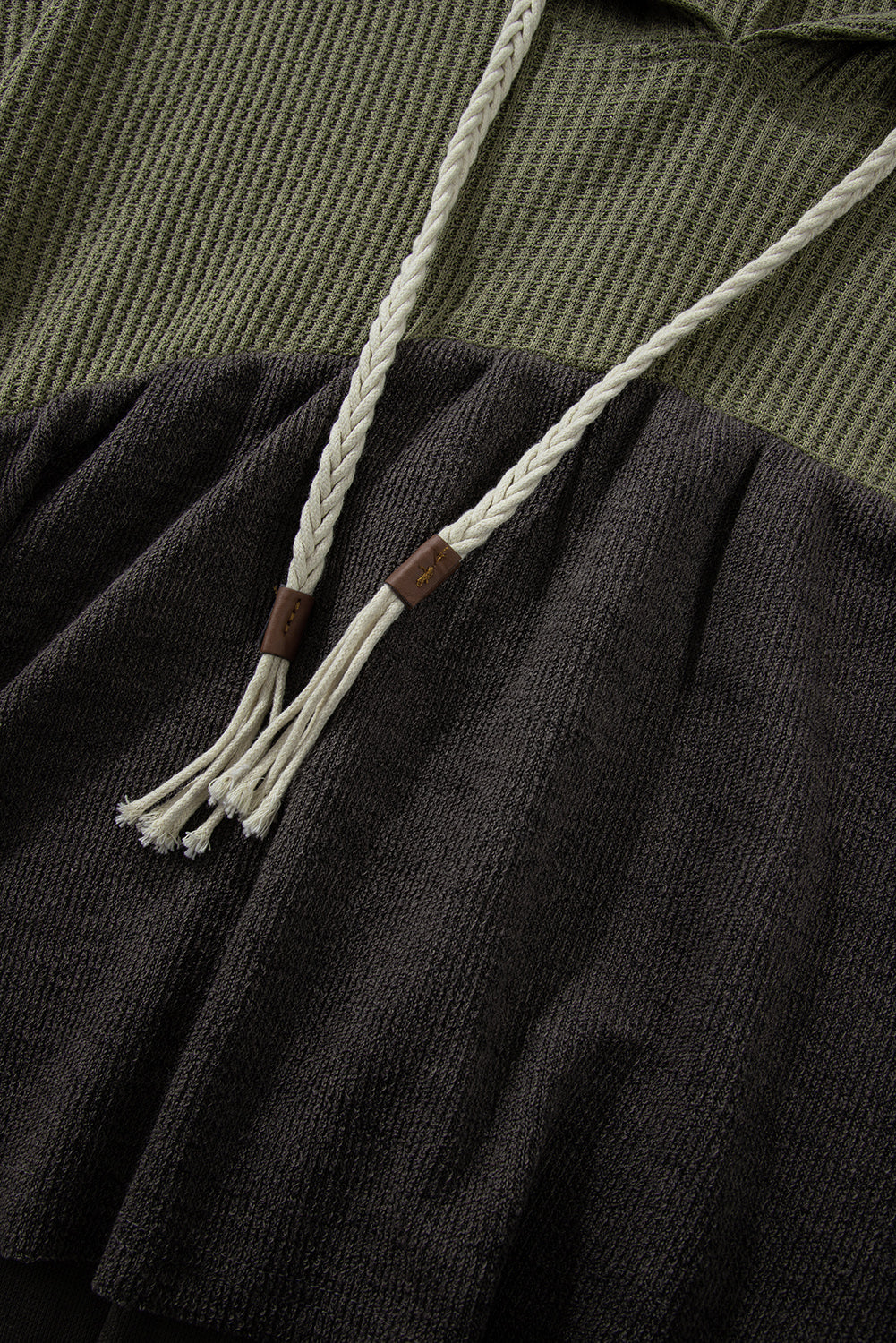 Laurel Green Mixed Textured Colorblock Patchwork Wide Sleeve Frayed High Low Hooded Top
